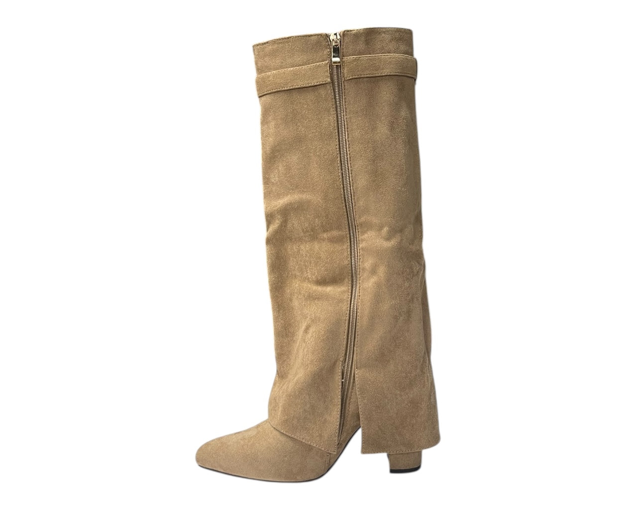 Women's knee high fold over boots feature an amazing faux suede material which covers the whole of the shoe including the leg for maximum effect with a stunning fold over detail. The boot also feature a cute buckle detail on top and have a block heel.